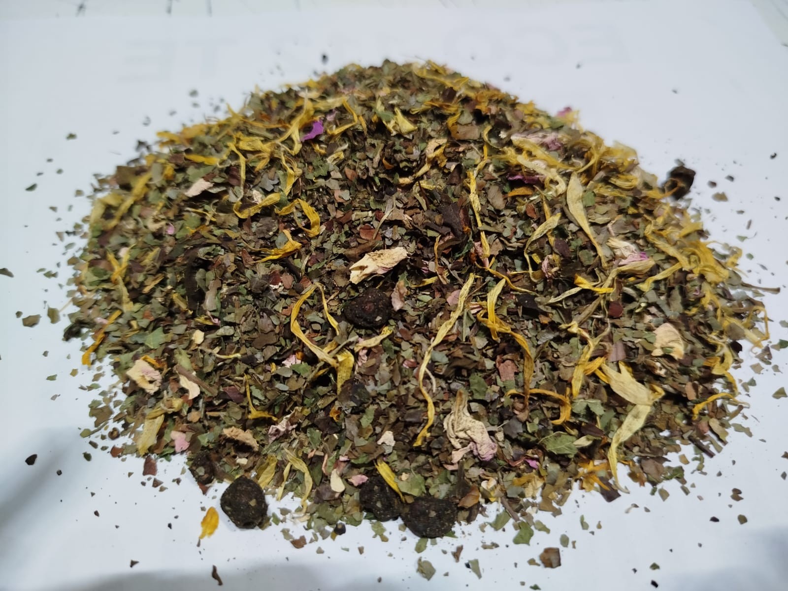 Ingredientes: *té blanco(67,75%), *cáscara de cacao, *mango, *hojas de ortiga, *pétalos de caléndula, *pétalos de rosas, *bayas de schizandra, *espirulina y aromas naturales.
